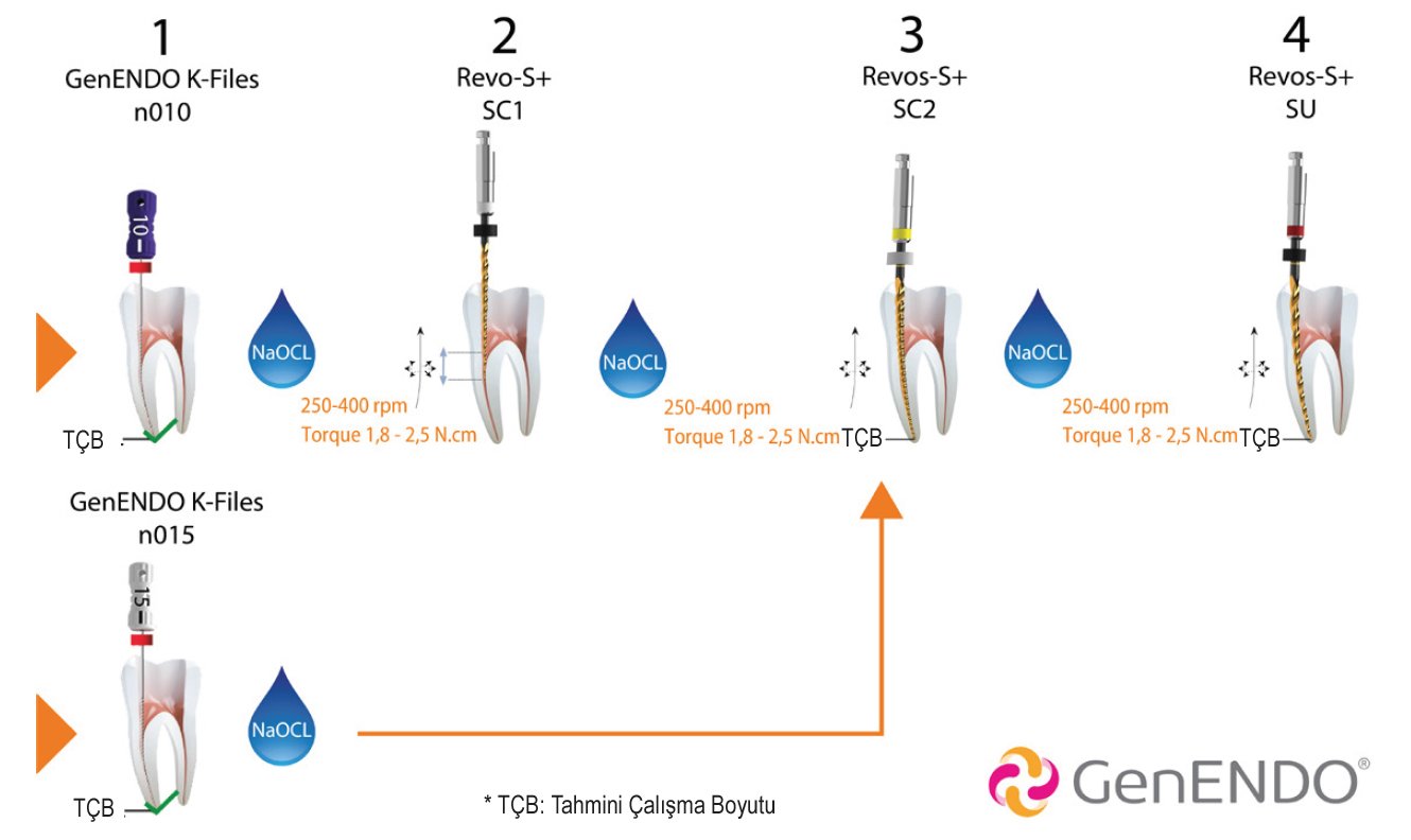 GenENDO Revo-S+, iş akışınızı kolaylaştırmak için üç basit adımda tutarlı sonuçlar sağlamak üzere tasarlanmış tam bir döner endodontik eğe dizisidir.